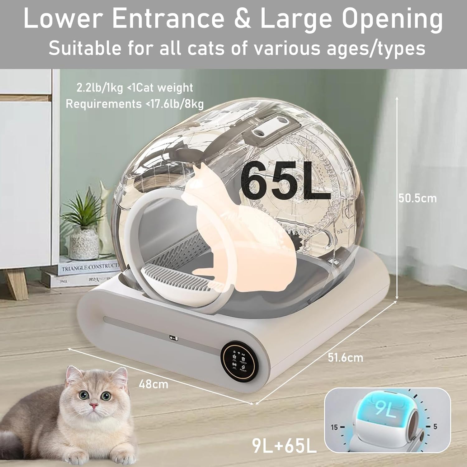 The internal space is 65L, allowing up to 9L of cat litter, which greatly reduces the sticking phenomenon. The overall dimensions are 18.9" x 20.5" x 19.9", occupying only 4.5 cubic feet of volume. The waste collection bin has a capacity of 9L, allowing up to 20 days of free scooping for one cat. The automatic cat litter box solves the problem of waste accumulation inside drawer-style trash bins. It is suitable for cats weighing between 1-15kg and accommodates various litter types, including mineral, Bentonite, tofu, and mixed litter.